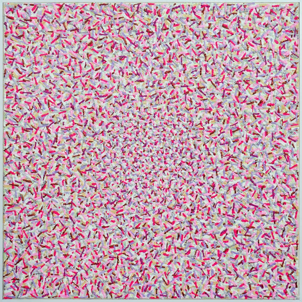 De voorpagina van de krant schreeuwt om aandacht. Net als een krant is het schilderij opgebouwd uit lagen / pagina’s. Elke laag met een eigen identiteit.